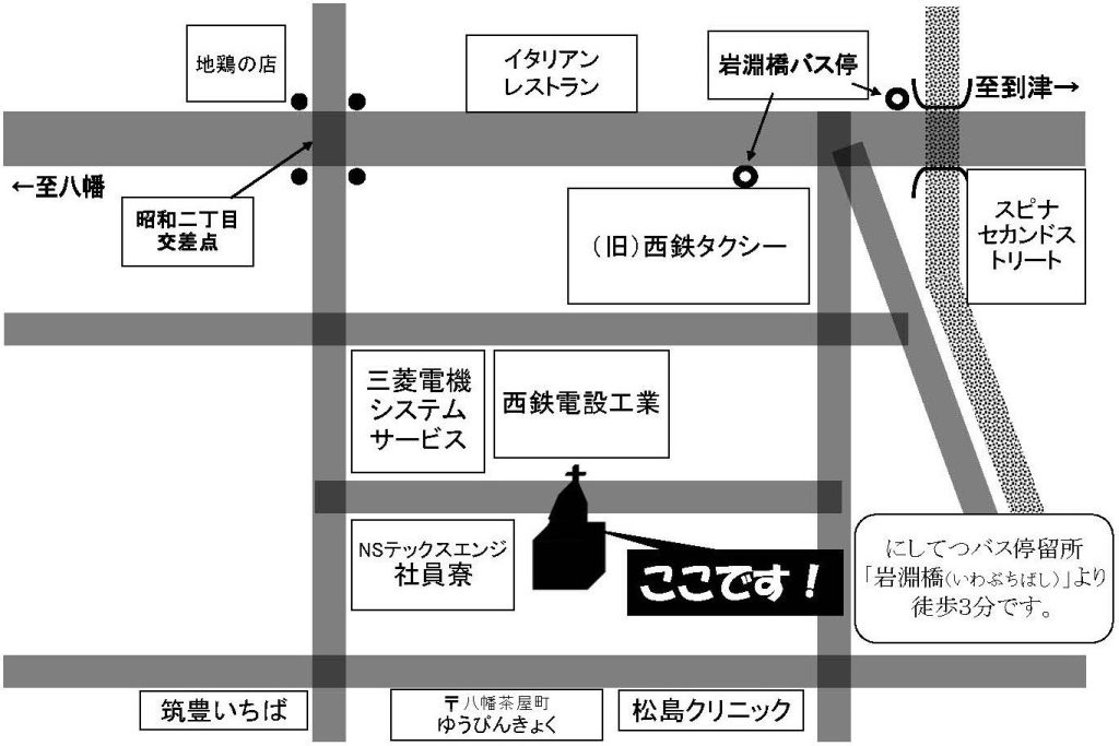 アクセス 住所:北九州市八幡東区昭和2-4-5TEL:093-652-1584 心のオアシス:木曜日 14:00〜17:00 礼拝:毎週日曜日 10:30〜11:15 平日祈祷会:隔週水曜日 14:00〜14:40